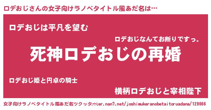 ロデおじさんの女子向けラノベタイトル風あだ名は… 『死神ロデおじの再婚』『ロデおじは平凡を望む』『横柄ロデおじと宰相陛下』 ツクッター #女子向けラノベタイトル風あだ名ツクッター http://tkutter.nan7.net/joshimukeranobetaitoruadana/128666/