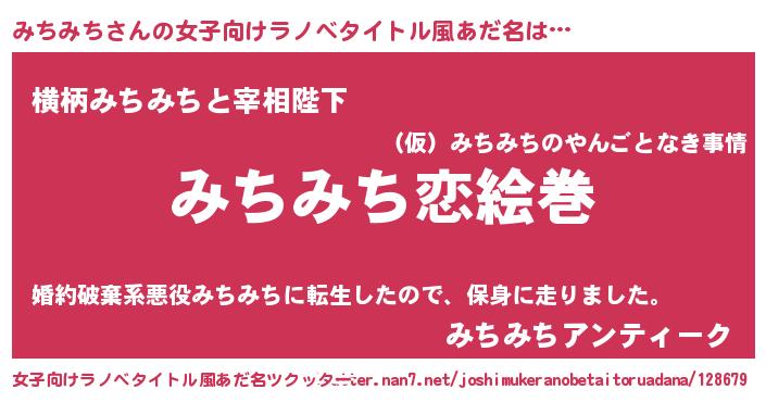 | 男性向けラノベタイトル風あだ名 | 『おまえをオタクにしてやるから、俺をみちみちにしてくれ! 』 |