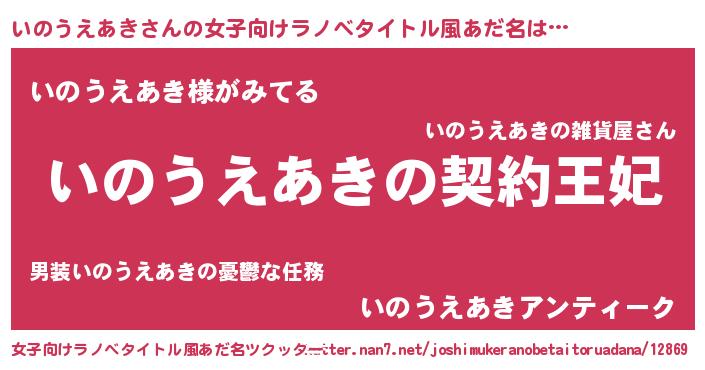 いのうえあきさんの女子向けラノベタイトル風あだ名は… 『いのうえあきの契約王妃』『いのうえあき様がみてる』『いのうえあきアンティーク』 ツクッター #女子向けラノベタイトル風あだ名ツクッター http://tkutter.nan7.net/joshimukeranobetaitoruadana/12869/