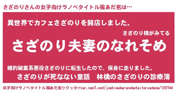 | 男性向けラノベタイトル風あだ名 | 『おまえをオタクにしてやるから、俺をさざのりにしてくれ! 』 |