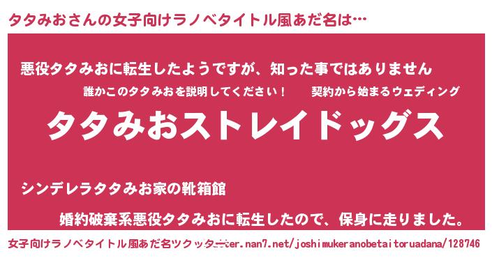 | 男性向けラノベタイトル風あだ名 | 『Re:タタみおから始める異世界生活』 |