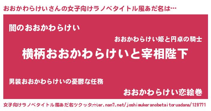 | 男性向けラノベタイトル風あだ名 | 『おおかわらけいに滅ぼされるだけの簡単なお仕事です』 |