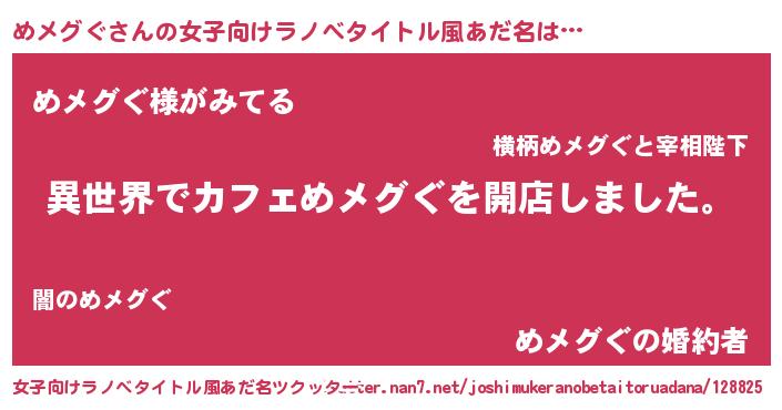めメグぐさんの女子向けラノベタイトル風あだ名は… 『異世界でカフェめメグぐを開店しました。』『めメグぐ様がみてる』『めメグぐの婚約者』 ツクッター #女子向けラノベタイトル風あだ名ツクッター http://tkutter.nan7.net/joshimukeranobetaitoruadana/128825/