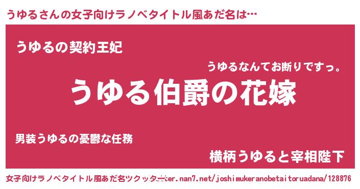 | 男性向けラノベタイトル風あだ名 | 『うちの娘の為ならば、俺はもしかしたらうゆるも倒せるかもしれない。』 |