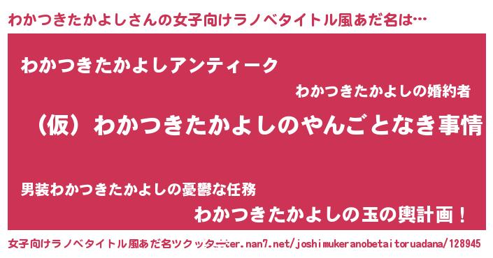 わかつきたかよしさんの女子向けラノベタイトル風あだ名は… 『(仮)わかつきたかよしのやんごとなき事情』『わかつきたかよしアンティーク』『わかつきたかよしの玉の輿計画!』 ツクッター #女子向けラノベタイトル風あだ名ツクッター http://tkutter.nan7.net/joshimukeranobetaitoruadana/128945/