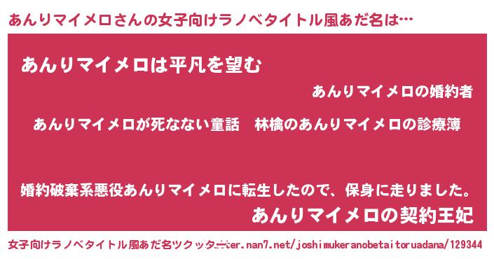 | 男性向けラノベタイトル風あだ名 | 『魔弾の王とあんりマイメロ』 |