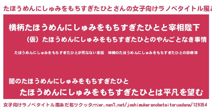 | 意味不明あだ名 | 『住所不定無職たほうめんにしゅみをもちすぎたひと(98歳)』 |