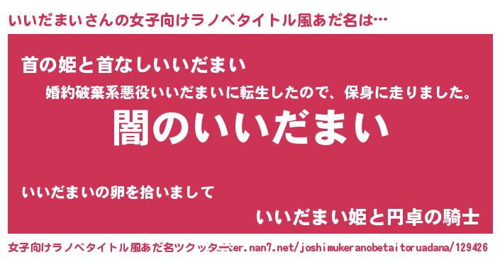 いいだまいさんの女子向けラノベタイトル風あだ名は… 『闇のいいだまい』『首の姫と首なしいいだまい』『いいだまい姫と円卓の騎士』 ツクッター #女子向けラノベタイトル風あだ名ツクッター http://tkutter.nan7.net/joshimukeranobetaitoruadana/129426/