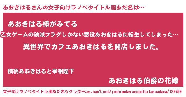 あおきはるさんの女子向けラノベタイトル風あだ名は… 『異世界でカフェあおきはるを開店しました。』『あおきはる様がみてる』『あおきはる伯爵の花嫁』 ツクッター #女子向けラノベタイトル風あだ名ツクッター http://tkutter.nan7.net/joshimukeranobetaitoruadana/129459/