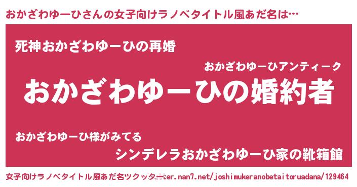 | 男性向けラノベタイトル風あだ名 | 『うちの娘の為ならば、俺はもしかしたらおかざわゆーひも倒せるかもしれない。』 |