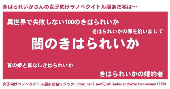 | 男性向けラノベタイトル風あだ名 | 『Re:きはられいかから始める異世界生活』 |