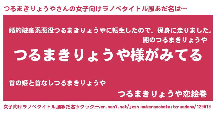 | 男性向けラノベタイトル風あだ名 | 『つるまきりょうやの嫁は女の子じゃないと思った?』 |