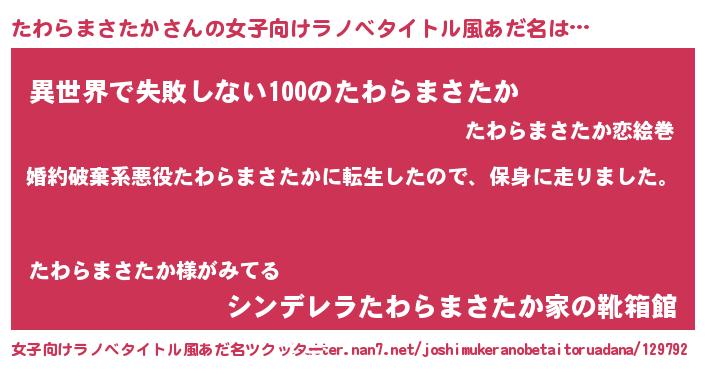 たわらまさたかさんの女子向けラノベタイトル風あだ名は… 『婚約破棄系悪役たわらまさたかに転生したので、保身に走りました。』『異世界で失敗しない100のたわらまさたか』『シンデレラたわらまさたか家の靴箱館』 ツクッター #女子向けラノベタイトル風あだ名ツクッター http://tkutter.nan7.net/joshimukeranobetaitoruadana/129792/