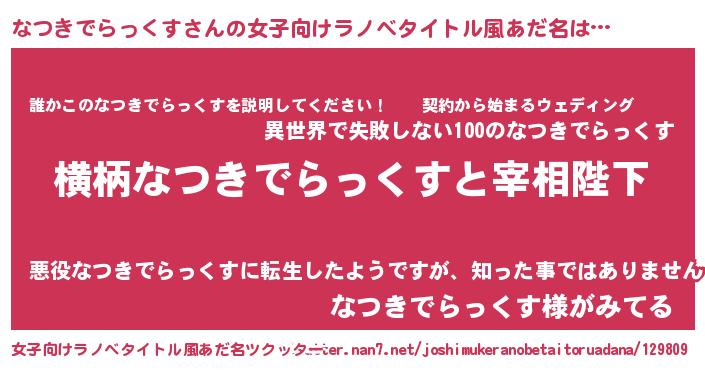 なつきでらっくすさんの女子向けラノベタイトル風あだ名は… 『横柄なつきでらっくすと宰相陛下』『誰かこのなつきでらっくすを説明してください! ~契約から始まるウェディング~』『なつきでらっくす様がみてる』 ツクッター #女子向けラノベタイトル風あだ名ツクッター http://tkutter.nan7.net/joshimukeranobetaitoruadana/129809/