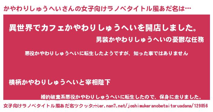 | 男性向けラノベタイトル風あだ名 | 『この素晴らしい世界にかやわりしゅうへいを!』 |
