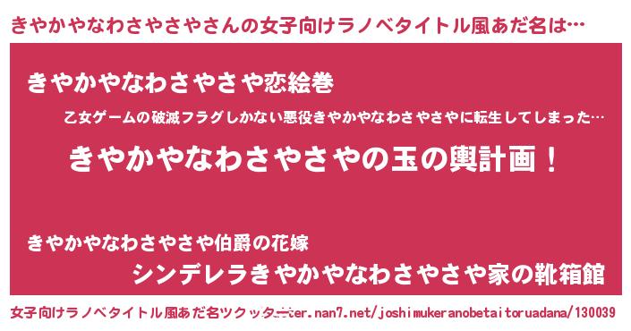 | 男性向けラノベタイトル風あだ名 | 『きやかやなわさやさや~年齢イコール彼女いない歴の魔法使い~』 |