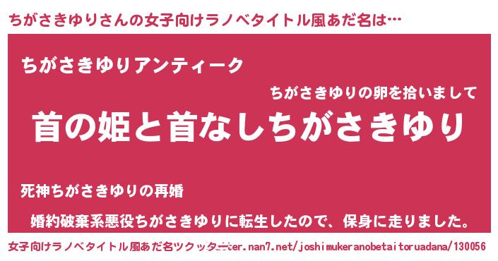 ちがさきゆりさんの女子向けラノベタイトル風あだ名は… 『首の姫と首なしちがさきゆり』『ちがさきゆりアンティーク』『婚約破棄系悪役ちがさきゆりに転生したので、保身に走りました。』 ツクッター #女子向けラノベタイトル風あだ名ツクッター http://tkutter.nan7.net/joshimukeranobetaitoruadana/130056/