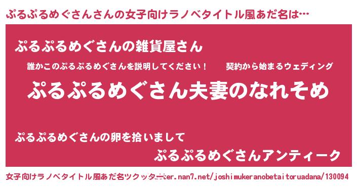 | 男性向けラノベタイトル風あだ名 | 『おまえをオタクにしてやるから、俺をぷるぷるめぐさんにしてくれ! 』 |