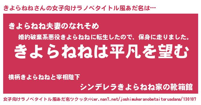 | 男性向けラノベタイトル風あだ名 | 『ダンジョンにきよらねねを求めるのは間違っているだろうか』 |