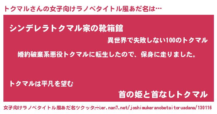 | 男性向けラノベタイトル風あだ名 | 『転生したらトクマルだった件』 |