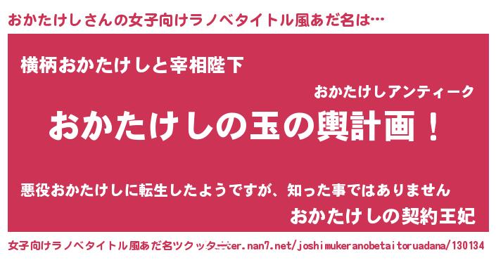 | 男性向けラノベタイトル風あだ名 | 『おかたけし~年齢イコール彼女いない歴の魔法使い~』 |