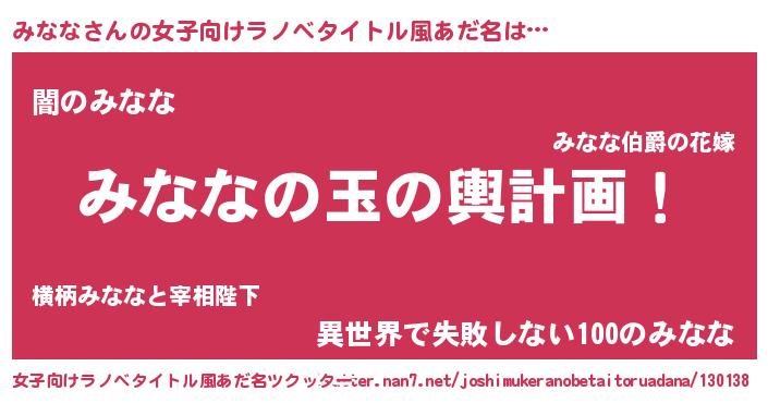 | 男性向けラノベタイトル風あだ名 | 『みなな~年齢イコール彼女いない歴の魔法使い~』 |