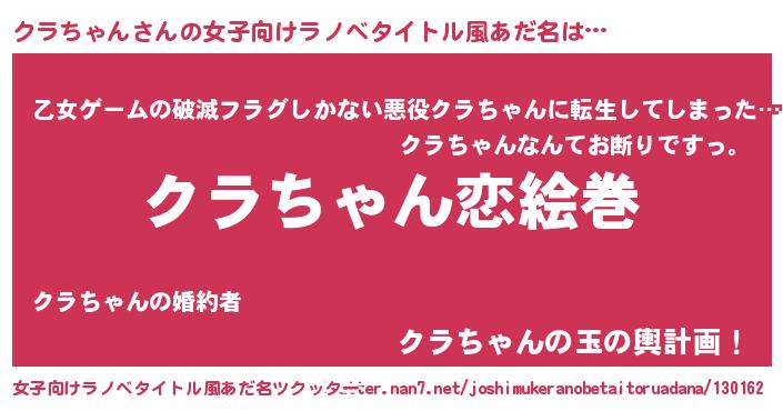 | 男性向けラノベタイトル風あだ名 | 『おまえをオタクにしてやるから、俺をクラちゃんにしてくれ! 』 |