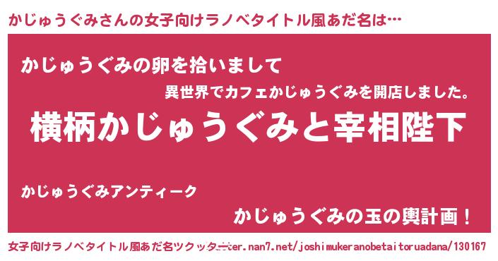 | 男性向けラノベタイトル風あだ名 | 『かじゅうぐみに滅ぼされるだけの簡単なお仕事です』 |