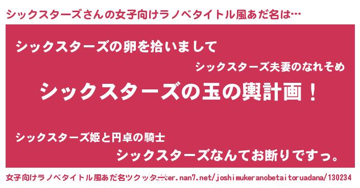 | 男性向けラノベタイトル風あだ名 | 『シックスターズ~年齢イコール彼女いない歴の魔法使い~』 |
