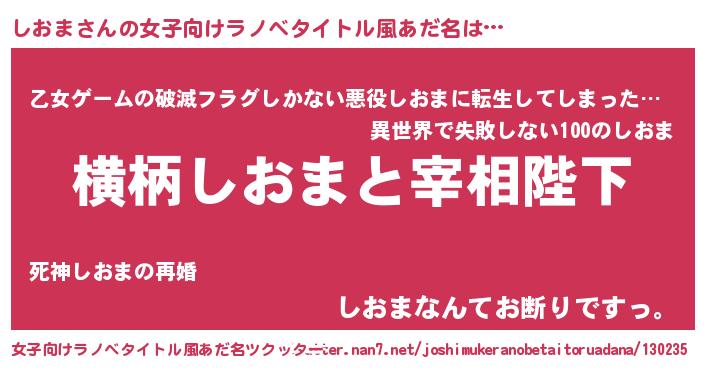 | 男性向けラノベタイトル風あだ名 | 『しおまに滅ぼされるだけの簡単なお仕事です』 |
