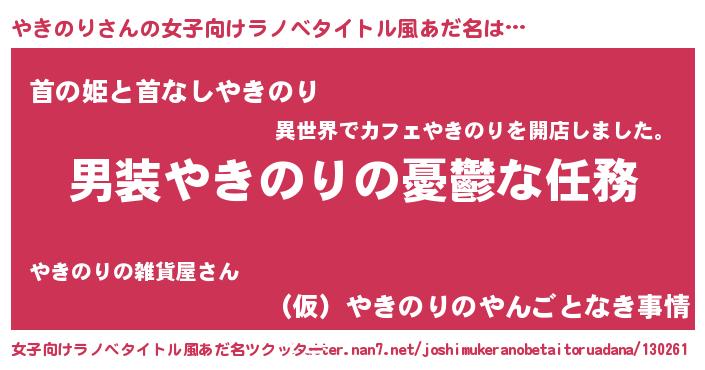 | 男性向けラノベタイトル風あだ名 | 『うちのやきのりが世界を掌握している!』 |