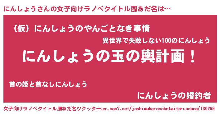 | 男性向けラノベタイトル風あだ名 | 『にんしょう~年齢イコール彼女いない歴の魔法使い~』 |