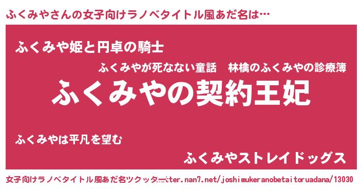 | 胡散臭い通販商品みたいなあだ名 | 『来世でも幸せになれる水素水…その名も「ふくみや」』 |
