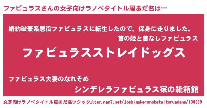 | 男性向けラノベタイトル風あだ名 | 『Re:ファビュラスから始める異世界生活』 |