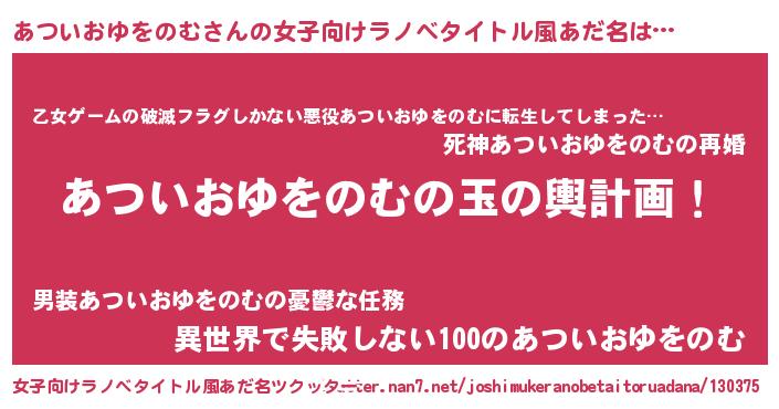 | ヒーロー風カッコイイあだ名 | 『仮面アツダー』『ネオアツイオユヲノム』 |