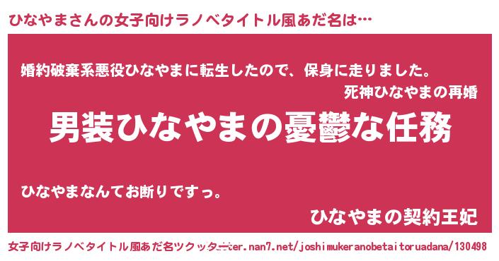 | 男性向けラノベタイトル風あだ名 | 『うちのひなやまが世界を掌握している!』 |