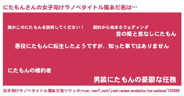 | 男性向けラノベタイトル風あだ名 | 『この素晴らしい世界ににたもんを!』 |