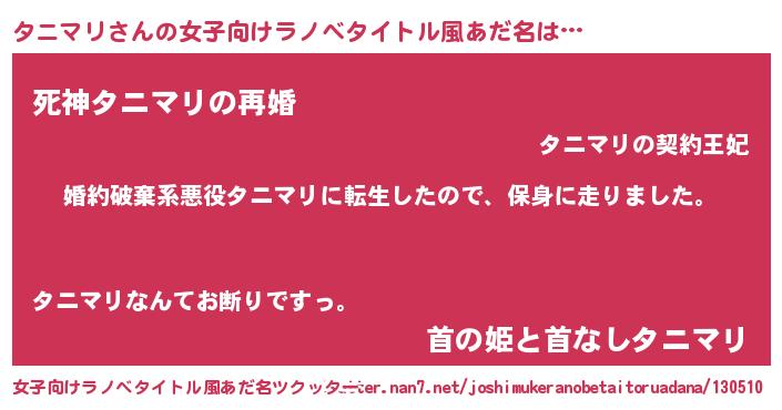 | 男性向けラノベタイトル風あだ名 | 『タニマリスレイヤー』 |
