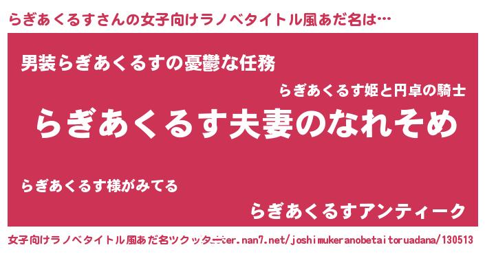 | 男性向けラノベタイトル風あだ名 | 『おまえをオタクにしてやるから、俺をらぎあくるすにしてくれ! 』 |