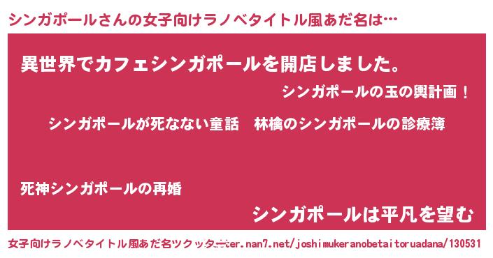 | 男性向けラノベタイトル風あだ名 | 『魔弾の王とシンガポール』 |