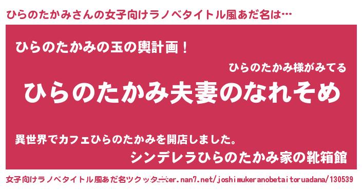 | 男性向けラノベタイトル風あだ名 | 『おまえをオタクにしてやるから、俺をひらのたかみにしてくれ! 』 |