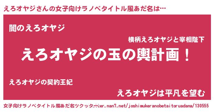 | 男性向けラノベタイトル風あだ名 | 『えろオヤジ~年齢イコール彼女いない歴の魔法使い~』 |
