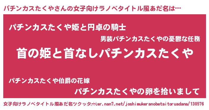 | 胡散臭い通販商品みたいなあだ名 | 『必ず成功するブレスレット…その名も「パチンカスたくや」』 |