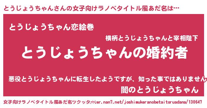 | 男性向けラノベタイトル風あだ名 | 『うちの娘の為ならば、俺はもしかしたらとうじょうちゃんも倒せるかもしれない。』 |