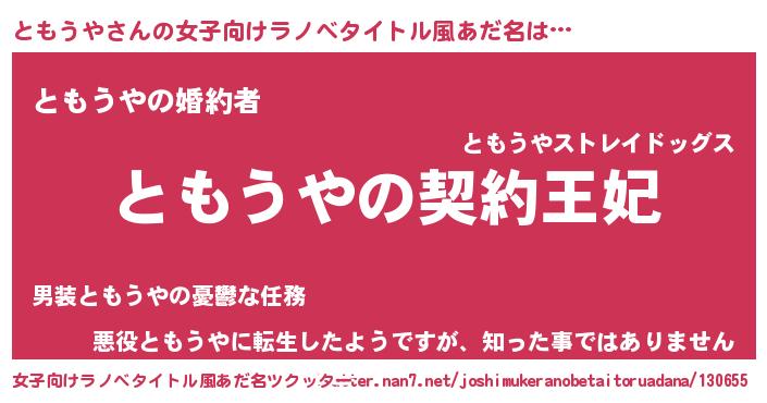 | 男性向けラノベタイトル風あだ名 | 『誰もが恐れるあのともうやが、ぼくの専属メイドになるようです。』 |