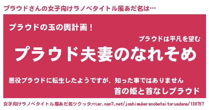 | 男性向けラノベタイトル風あだ名 | 『おまえをオタクにしてやるから、俺をプラウドにしてくれ! 』 |