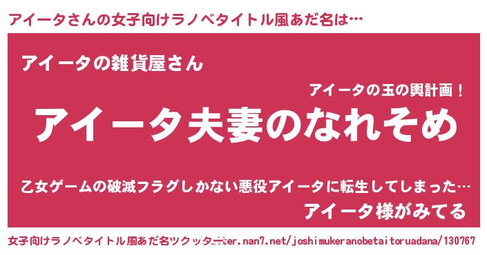 | 男性向けラノベタイトル風あだ名 | 『おまえをオタクにしてやるから、俺をアイータにしてくれ! 』 |