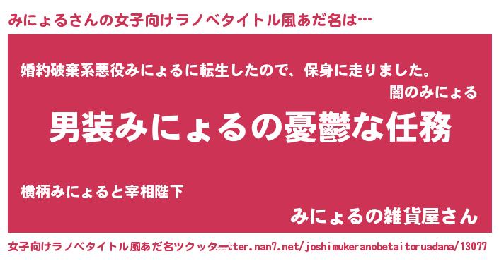| 男性向けラノベタイトル風あだ名 | 『冴えないみにょるの育てかた』 |