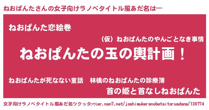 | 男性向けラノベタイトル風あだ名 | 『ねおぱんた~年齢イコール彼女いない歴の魔法使い~』 |