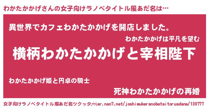 | 男性向けラノベタイトル風あだ名 | 『わかたかかげに滅ぼされるだけの簡単なお仕事です』 |
